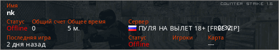 Играет на Counter Strike 1.6 сервере. Страна: РоссияПервый раз замечен 02:29 03.12.2025