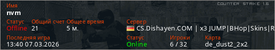 Последний раз был в сети 13:40 07.03.2026 Игрок с таким ником замечен на 13 серверах