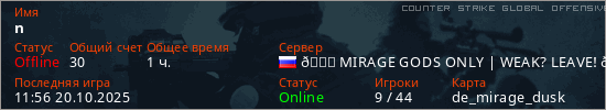 Играет на Counter Strike Global Offensive сервере. Страна: РоссияПервый раз замечен 11:14 18.04.2024