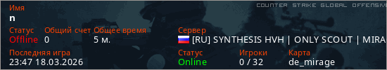 Играет на Counter Strike Global Offensive сервере. Страна: РоссияПервый раз замечен 23:40 18.03.2026