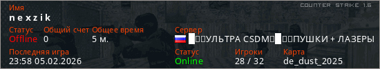 Играет на Counter Strike 1.6 сервере. Страна: РоссияПервый раз замечен 23:52 05.02.2026