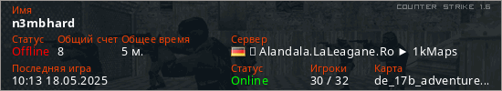 Играет на Counter Strike 1.6 сервере. Страна: ГерманияПервый раз замечен 10:09 18.05.2025