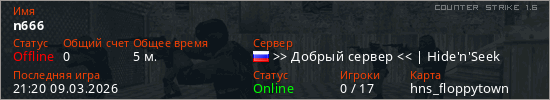 Играет на Counter Strike 1.6 сервере. Страна: РоссияПервый раз замечен 21:14 09.03.2026
