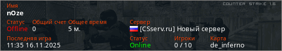 Играет на Counter Strike 1.6 сервере. Страна: РоссияПервый раз замечен 11:33 16.11.2025