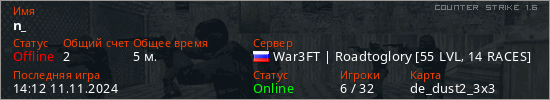 Играет на Counter Strike 1.6 сервере. Страна: РоссияПервый раз замечен 14:02 11.11.2024