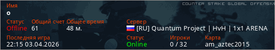 Играет на Counter Strike Global Offensive сервере. Страна: РоссияПервый раз замечен 20:14 22.03.2026