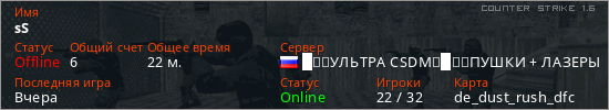 Играет на Counter Strike 1.6 сервере. Страна: РоссияПервый раз замечен 12:57 31.03.2026