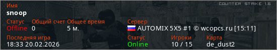 Играет на Counter Strike 1.6 сервере. Страна: РоссияПервый раз замечен 18:24 20.02.2026