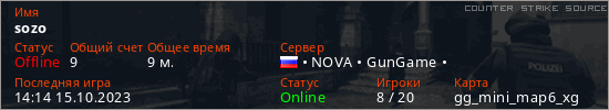 Играет на Counter Strike Source сервере. Страна: РоссияПервый раз замечен 17:30 16.09.2023