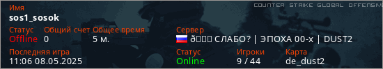 Играет на Counter Strike Global Offensive сервере. Страна: РоссияПервый раз замечен 11:04 08.05.2025
