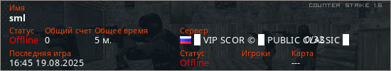 Играет на Counter Strike 1.6 сервере. Страна: РоссияПервый раз замечен 16:26 19.08.2025