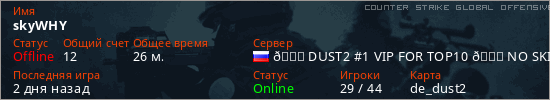 Играет на Counter Strike Global Offensive сервере. Страна: РоссияПервый раз замечен 22:33 29.07.2025