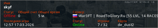 Играет на Counter Strike 1.6 сервере. Страна: РоссияПервый раз замечен 12:53 17.03.2026