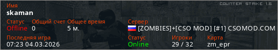Играет на Counter Strike 1.6 сервере. Страна: РоссияПервый раз замечен 07:18 04.03.2026