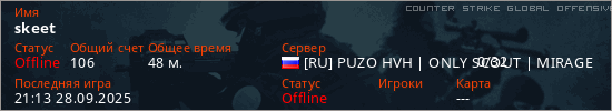 Играет на Counter Strike Global Offensive сервере. Страна: РоссияПервый раз замечен 13:07 05.07.2025