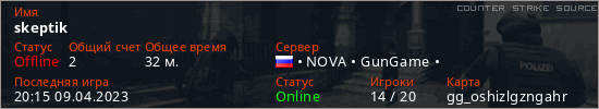 Играет на Counter Strike Source сервере. Страна: РоссияПервый раз замечен 12:34 05.04.2023