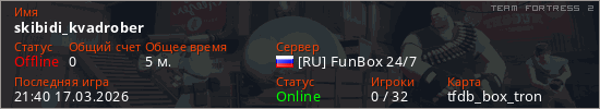 Играет на Team Fortress 2 сервере. Страна: РоссияПервый раз замечен 21:38 17.03.2026
