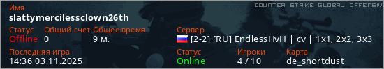 Играет на Counter Strike Global Offensive сервере. Страна: РоссияПервый раз замечен 12:26 28.10.2025