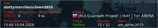 Играет на Counter Strike Global Offensive сервере. Страна: РоссияПервый раз замечен 19:40 18.04.2026