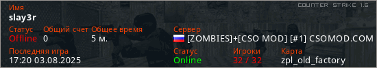 Играет на Counter Strike 1.6 сервере. Страна: РоссияПервый раз замечен 17:09 03.08.2025