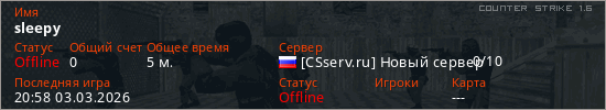 Играет на Counter Strike 1.6 сервере. Страна: РоссияПервый раз замечен 20:56 03.03.2026