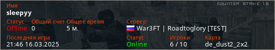Играет на Counter Strike 1.6 сервере. Страна: РоссияПервый раз замечен 21:40 16.03.2025