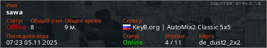 Играет на Counter Strike 1.6 сервере. Страна: РоссияПервый раз замечен 06:56 05.11.2025