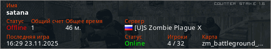 Играет на Counter Strike 1.6 сервере. Страна: РоссияПервый раз замечен 19:32 12.01.2025