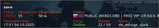 Играет на Counter Strike Global Offensive сервере. Страна: РоссияПервый раз замечен 16:09 05.09.2025