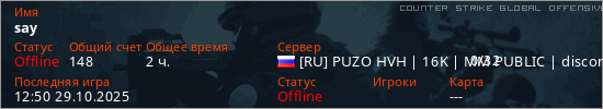 Играет на Counter Strike Global Offensive сервере. Страна: РоссияПервый раз замечен 11:51 30.05.2025