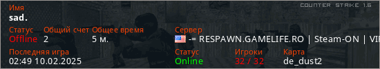 Играет на Counter Strike 1.6 сервере. Страна: СШАПервый раз замечен 02:47 10.02.2025