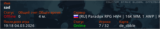 Играет на Counter Strike Global Offensive сервере. Страна: РоссияПервый раз замечен 19:16 04.03.2026