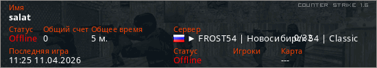 Играет на Counter Strike 1.6 сервере. Страна: РоссияПервый раз замечен 10:51 11.04.2026