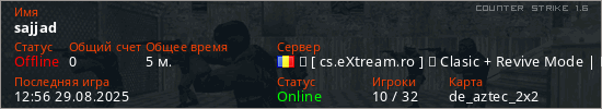 Играет на Counter Strike 1.6 сервере. Страна: РумынияПервый раз замечен 12:46 29.08.2025