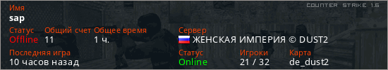 Играет на Counter Strike 1.6 сервере. Страна: РоссияПервый раз замечен 15:22 12.11.2025