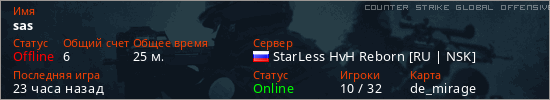 Играет на Counter Strike Global Offensive сервере. Страна: РоссияПервый раз замечен 09:47 30.09.2025