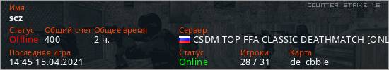 Играет на Counter Strike 1.6 сервере. Страна: РоссияПервый раз замечен 21:39 21.02.2020