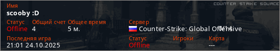 Играет на Counter Strike Source сервере. Страна: РоссияПервый раз замечен 20:57 24.10.2025