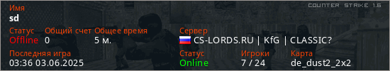 Играет на Counter Strike 1.6 сервере. Страна: РоссияПервый раз замечен 00:06 03.06.2025