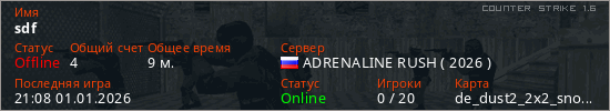 Играет на Counter Strike 1.6 сервере. Страна: РоссияПервый раз замечен 19:39 01.01.2026
