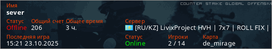 Играет на Counter Strike Global Offensive сервере. Страна: КазахстанПервый раз замечен 17:09 07.10.2025