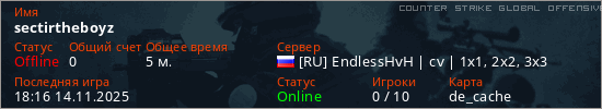Играет на Counter Strike Global Offensive сервере. Страна: РоссияПервый раз замечен 18:14 14.11.2025