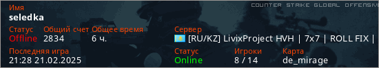 Играет на Counter Strike Global Offensive сервере. Страна: КазахстанПервый раз замечен 16:39 01.02.2025