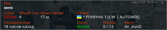 Последний раз был в сети 16 часов назад Игрок с таким ником замечен на 17 серверах