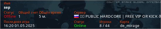 Играет на Counter Strike Global Offensive сервере. Страна: РоссияПервый раз замечен 16:18 01.05.2025