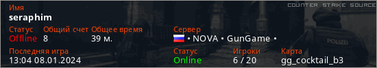 Играет на Counter Strike Source сервере. Страна: РоссияПервый раз замечен 01:45 11.07.2023