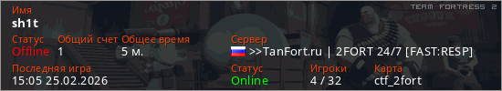 Играет на Team Fortress 2 сервере. Страна: РоссияПервый раз замечен 14:50 25.02.2026