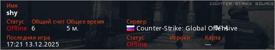 Играет на Counter Strike Source сервере. Страна: РоссияПервый раз замечен 17:07 13.12.2025
