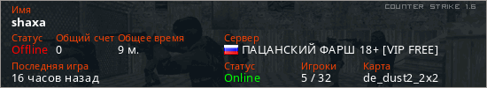 Играет на Counter Strike 1.6 сервере. Страна: РоссияПервый раз замечен 12:30 07.03.2026