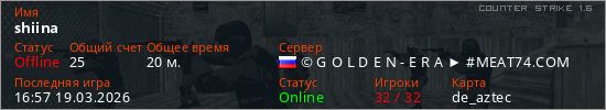 Играет на Counter Strike 1.6 сервере. Страна: РоссияПервый раз замечен 16:33 19.03.2026